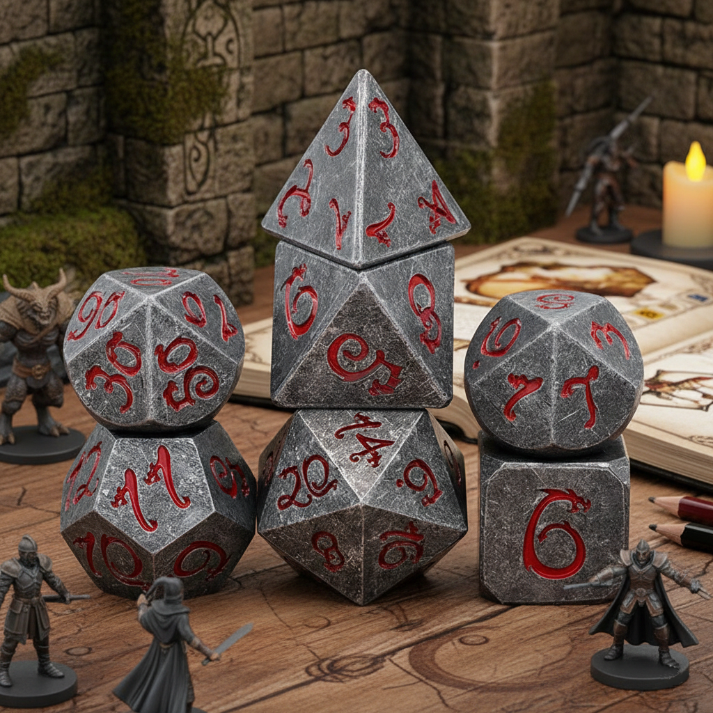 - Solid Stone 7-Piece Polyhedral Dice Set: Includes D4, D6, D8, D10, D12, D20, and D100. Designed for tabletop RPG players who want weight, presence, and authority in every roll.