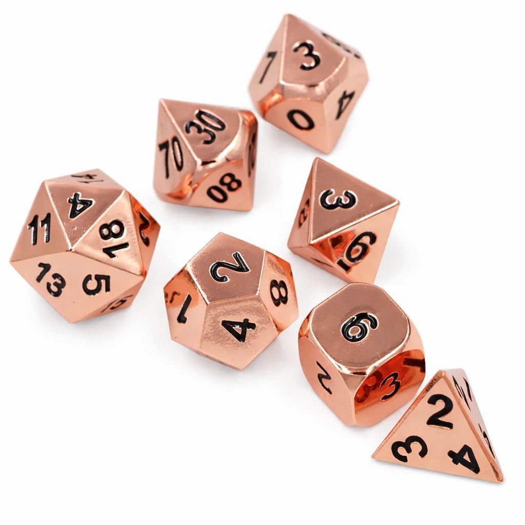 - Ensemble de dés polyédriques en métal noir et cuivre. L'ensemble comprend 7 pièces: D4, D6, D8, D10, D100, D12 et D20. Ces dés polyédriques sont fabriqués en alliage de zinc de qualité avec une surface en émail brillant.