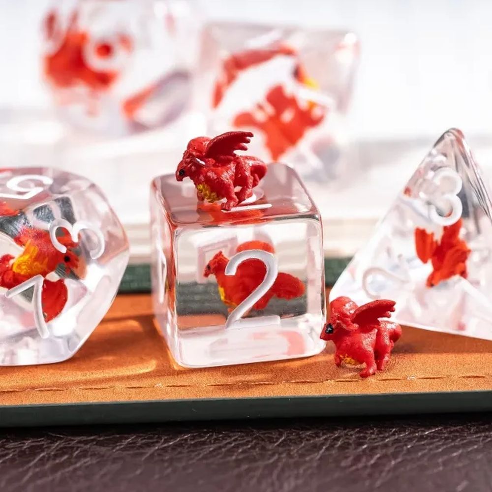 - Red Dragon Dice Set. The set includes 7 pieces: D4, D6, D8, D10, D100, D12, and D20. These polyhedral dice are made out of durable acrylic material.